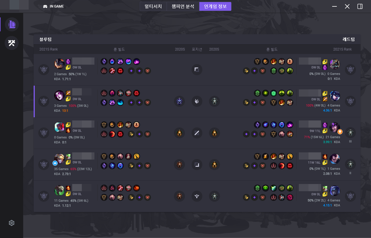 중앙 상단 인게임 정보를 클릭하면 우리 팀과 상대팀의 인게임 정보를 볼 수 있습니다.