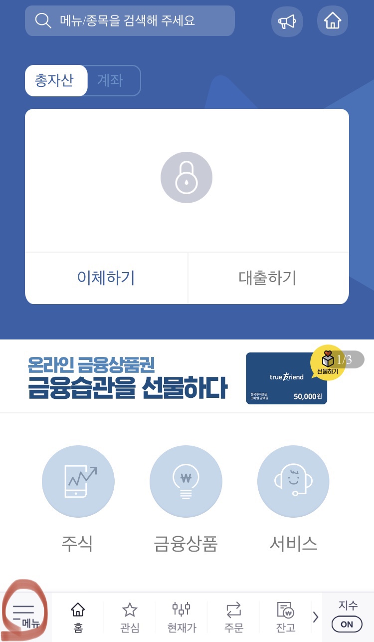 계좌에 들어가면 메인 화면 하단에 '메뉴' 창으로 들어갑니다.