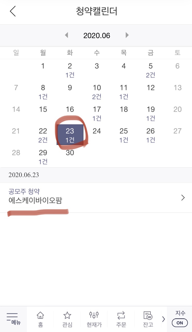 청약 캘린더를 확인하면 2020년 6월 23일 1건 에스케이바이오팜이 나옵니다.
