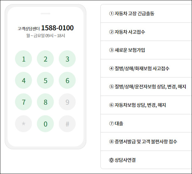1588-0100으로 전화한 후, 자동차 고장 긴급출동은 1번, 대출은 2번, 상담사 연결은 0번을 누르면됩니다.