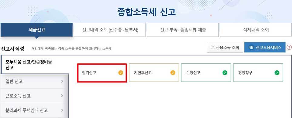 2) 홈택스 메인에서 [종합소득세 확정신고]를 클릭하여 종합소득세 신고 페이지로 이동, 기간내에 신고하신다면, 정기신고를 클릭하고 요청하는 내용을 작성하면 됩니다.