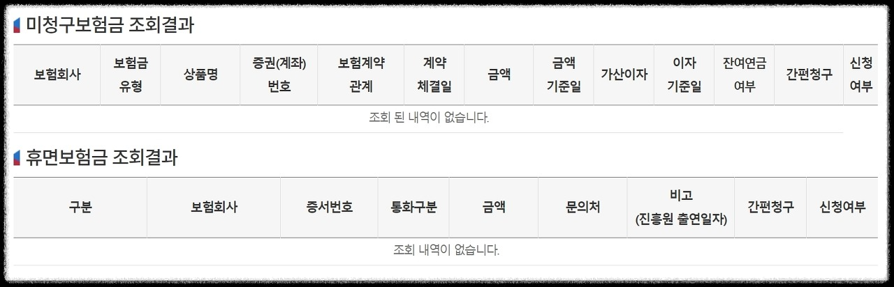 4. 조회가 완료되면 미청구보험금과, 휴면보험금을 아래와 같이 조회결과를 확인하실 수 있습니다.