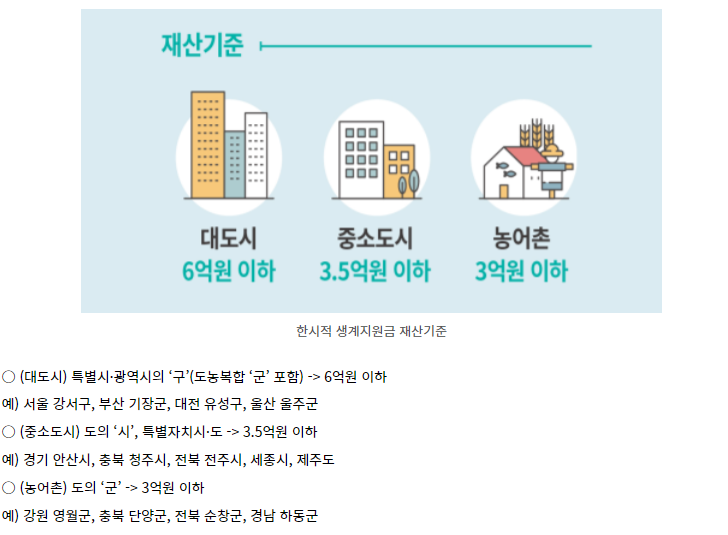 대도시 6억 / 중소도시 3억5천만 / 농어촌 3억 이하 여야 하며, 행복e음 시스템 조회를 통해 회신된 재산정보 일체 / 금융재산 및 부채는 반영하지 않습니다.