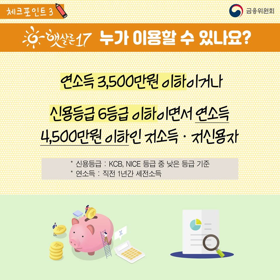 사실 위 카드뉴스는 햇살론 17이라서 약간 다른 지원이긴 한데, 요건은 동일합니다(그래서 참고용으로 가져왔어요)